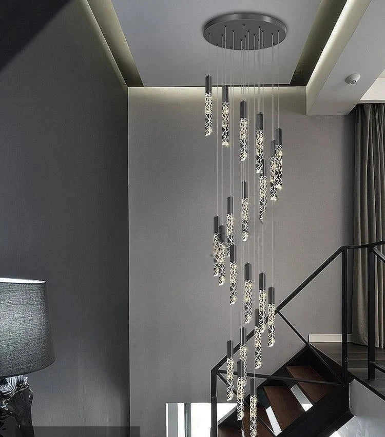 The Stair Chandelier Duplex Loft Spiral Staircase Long Chandelier offers flexible installation options to suit various spaces. Suitable for spiral staircases and duplex lofts, this chandelier can be installed in living rooms, entryways, or hallways. Its adjustable length ensures seamless integration into any modern interior design.